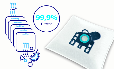 Dat de Cleanbag Professional stofzakken een hoogwaardig alternatief zijn voor originele stofzakken blijkt uit de hygiënische filtratie: een combinatie van 5 lagen zorgen voor een filtratiegraad van 99,9%. Ideaal voor mensen met een allergie! De hygiënische afsluiting van de stofzakken voorkomt dat de motor valse lucht zuigt waardoor het vermogen van de stofzuiger niet vermindert. Daarnaast voorkomt het de terugslag van stof in het stofzakcompartiment voor een langere levensduur van de stofzuiger.